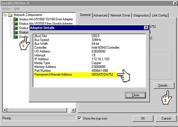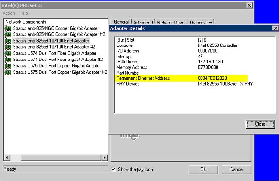 Figure 1 - Intel® PROSet II GUI showing MAC address of Network Interface adapter For the Stratus® U515, U570, U571, U574 and U575 adapters, the OUI will belong to Intel, since Intel makes the cards. All the U515, U570 and U571 adapters that I have seen have an OUI of 00-03-47, while all the U574 and U575 adapters that I have seen have an OUI of 00-04-23. However, I cannot guarantee that these OUIs are consistent for all cards or that Intel will continue to use these OUIs for these cards in the future.