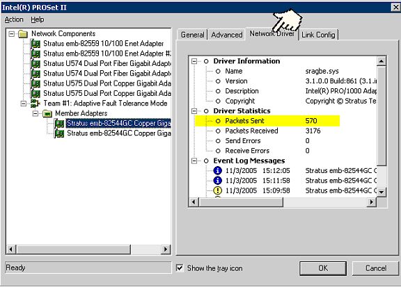 When looking at a trace, if the source MAC address is the team's MAC address, it may not be possible to determine which adapter actually sent the frame. However, you can figure it out if the team mode is "Adapter Fault Tolerance" or "Switch Fault Tolerance". In these modes only one adapter ever sends out data frames. You can determine which adapter is sending by looking at the "Packets Sent" statistics in PROSet. Only one adapter should have the "Packets Sent" count go up (see figure 7).