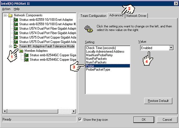 If you notice that more than one member of the team has "Packets Sent" increasing (not just non-zero, but increasing), it is probably because probes are turned on. Probes are used to test link connectivity as well as confirm that the adapters can send and receive frames. You can turn off probes by selecting the team (1), and then the advanced tab (2) and then the probe setting (3) and changing the value from Enabled to Disabled (4) (see figure 8).