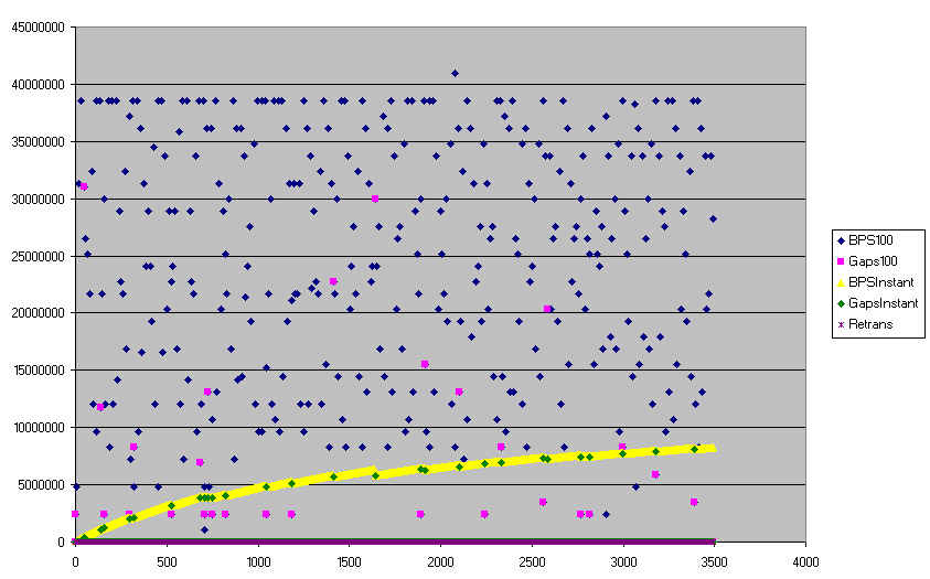 Two things are important to note. First, the FTP command line reported a throughput of 8210K bytes/sec. This agrees with the final cumulative value in the graph. Second, the cumulative total is much less than the typical throughput for a 0.000607 second interval, and much much less than the maximum value. Discounting the 1 data point above 40,000,000, there is a noticeable plateau at 38,515,440.8 bytes per second - which is 301 Mb/sec.