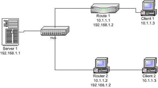 How can you generate these errors? The network shown in figure 1 can be used to create both the reset and timeout scenario. Client 1 and client 2 both have the same IP address (10.1.1.3). Each is connected to a device that can act as a router. Client 2 is connected to a PC with software that allows it to act as a router (more on that later). Client 1 can be connected to a "real" router or a PC with the same routing software as router 2. Since each router has the same set of routes it is important that the routers do not broadcast their routes to each other. The routers' other interfaces are connected to a hub along with the server.