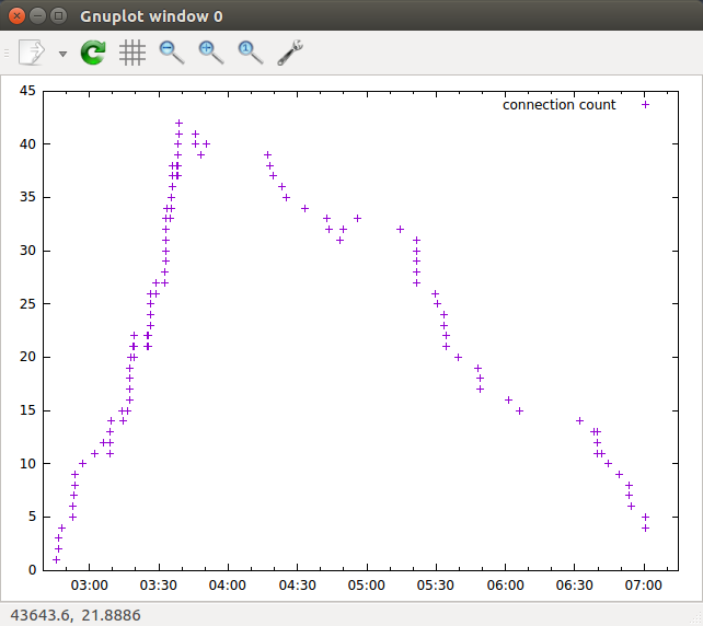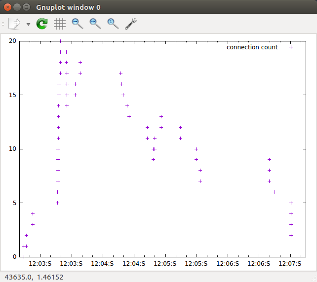 | gnuplot . . . gnuplot> set xdata time gnuplot> set timefmt "%H:%M:%S" gnuplot> set xrange ["12:02:40":"12:07:15"] gnuplot> set format x "%H:%M:S" gnuplot> plot "foo" using 8:1 title "connection count" |