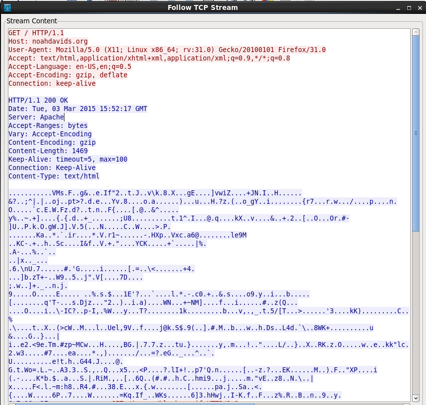 | ./programs/sh/tshark-follow-stream.sh test3.pcapng 32885 80 192.168.1.200 32885 ---> 50.62.107.1 80 GET / HTTP/1.1..Host: noahdavids.org..User-Agent: Mozilla/5.0 (X11; Linux x86_6 4; rv:31.0) Gecko/20100101 Firefox/31.0..Accept: text/html,application/xhtml+xm l,application/xml;q=0.9,*/*;q=0.8..Accept-Language: en-US,en;q=0.5..Accept-Enco ding: gzip, deflate..Connection: keep-alive.... 50.62.107.1 80 ---> 192.168.1.200 32885 HTTP/1.1 200 OK..Date: Tue, 03 Mar 2015 15:52:17 GMT..Server: Apache..Accept-Ra nges: bytes..Vary: Accept-Encoding..Content-Encoding: gzip..Content-Length: 146 9..Keep-Alive: timeout=5, max=100..Connection: Keep-Alive..Content-Type: text/h tml...............VMs.F..g&..e.If"2..t.J..v\k.8.X...gE....]vwiZ....+JN.I..H.... .. &?..;^|.|..oj..pt>?.d.e...Yv.8....o.a......)...u...H.?z.(..o_gY..i........{r 7...r.w.../....p....n..O.....`c.E.W.Fz.d?..t.n..F{....[.@..&^......y%..~.+].... {.{.d..+_.......;U8..........t.1^.I...@.q....kX..v....&..+.2..[..O...Or.#-]U..P .k.O.gW.J].V.5(...N.....C..W....>.P.........Ka..*.`.ir....*.V.r1~......-.HXp..V xc.a6@........le9M...KC-.+..h..Sc....I&f..V.+."....YCK.....+`.....|%...A-...%.. `.....|x.._.....6. U.7......#.'G.....i......[.=..\<.......+4.....]b.zT+-..W9.. 5..j".V[....7D.....;.w..]+._..n.j..9.....O.....E..... ..%.s.$...1E'?...`....l.* .-.c0.+..&.s....o9.y..i...b.....[........q'T-...s.Djz..."2..)..i.a)....WN...+~N M]....f...i......#..z(Q........O....i..\-IC?..p-I,.%W...y...T?........1k....... ..b...v,.,_.t.5/[T...>......'3....kK).........C..%..\....t..X..(>cW..M...l..Uel ,9V..f....j@k.S$.9(..].#.M..b...w..h.Ds..L4d.`\..8WK+..........u.&....G..}...|i ..e2.<9e.Tm.#zp~MCw...H....,BG.|.7.7.z...tu.}.......y,.m...!.."....L/..}..X..RK .z.O.....w..e..kk"lc.2.w3.....#7....ea....*.,)......./...=?.eG.._...^..`..U.... ......e!t.h..G44.J....@..G.t.Wo=.L.~..A3.3..S.,..Q...x5...<P....?.lI+!..p7'Q.n. .....[..-z.?...EK......M.. 50.62.107.1 80 ---> 192.168.1.200 32885 ).F.."XP....i(.-....K*b.$..a...S.|.RiM.,..[..6Q..(#.#..h.C..hmi9...j.....m."vE. .z8..N.\..|x.....F<.l.~m:h8..R4.#...38.E...x.{.w........[......pa.j..Sa..<.{... .W.....6P..7....W.......=Kq.If_..WKs......6]3.hHwj..I-K.f..F...z%.R..B..n..9..y . 6.7.Q6<.2Z................ 192.168.1.200 32885 ---> 50.62.107.1 80 GET /images/bluebar.gif HTTP/1.1..Host: noahdavids.org..User-Agent: Mozilla/5.0 (X11; Linux x86_64; rv:31.0) Gecko/20100101 Firefox/31.0..Accept: image/png,im age/*;q=0.8,*/*;q=0.5..Accept-Language: en-US,en;q=0.5..Accept-Encoding: gzip, deflate..Referer: http://noahdavids.org/..Connection: keep-alive.... 50.62.107.1 80 ---> 192.168.1.200 32885 HTTP/1.1 200 OK..Date: Tue, 03 Mar 2015 15:52:17 GMT..Server: Apache..Last-Modi fied: Tue, 18 May 2010 16:27:57 GMT..ETag: "3f1-486e0d2f65d40"..Accept-Ranges: bytes..Content-Length: 1009..Cache-Control: max-age=5184000..Expires: Sat, 02 M ay 2015 15:52:17 GMT..Keep-Alive: timeout=5, max=99..Connection: Keep-Alive..Co ntent-Type: image/gif....GIF89a@...w..!..MSOFFICE9.0.....msOPMSOFFICE9.0../V..! ..MSOFFICE9.0.....cmPPJCmp0712....H.s..!.....P.,....@.......................... ....................~..{..y..i~.e~._u.]r.T_sOx.Nw.Nv.Lx.Kv.Ju.Eh.Dd.DM]DLTCg.Ce .AO.=X.<F`;T.:AJ.G..C|.@g-27)<s(5J&2C&*+%2I%1@$2S$2Q#1T#.:!1_!,7.-T.,R. !.*N... ................R..G..Z..A..A..U..S..Q..1o.%6.!A.!/............................ ............................................................................... ................................................. ...P......................... ...............................'#................7+-...............71/-4#...... ......................H......*\.NA...ZHlQ...#.3j...... C..I....(S.\.....0c..I.. .....@Q....I...J....H.*].....P.J.J....X.j......`.....C...[.h.D...p....K....x... .........L......+^....%1X..a.G...3k.......C..M.....S.^......c..M..m.=(S........ ....8....#_..9....C...:....c...;....../.<....._o.H..>i..................(....h. ..&....6....F(...Vh......|-..B...(..$.h...|.a.....} .(..4.h.....!.:.@B.8.)..D.. ..@...; |