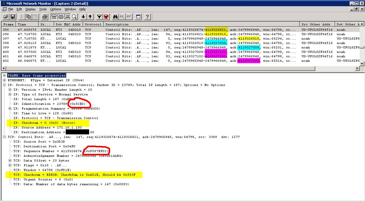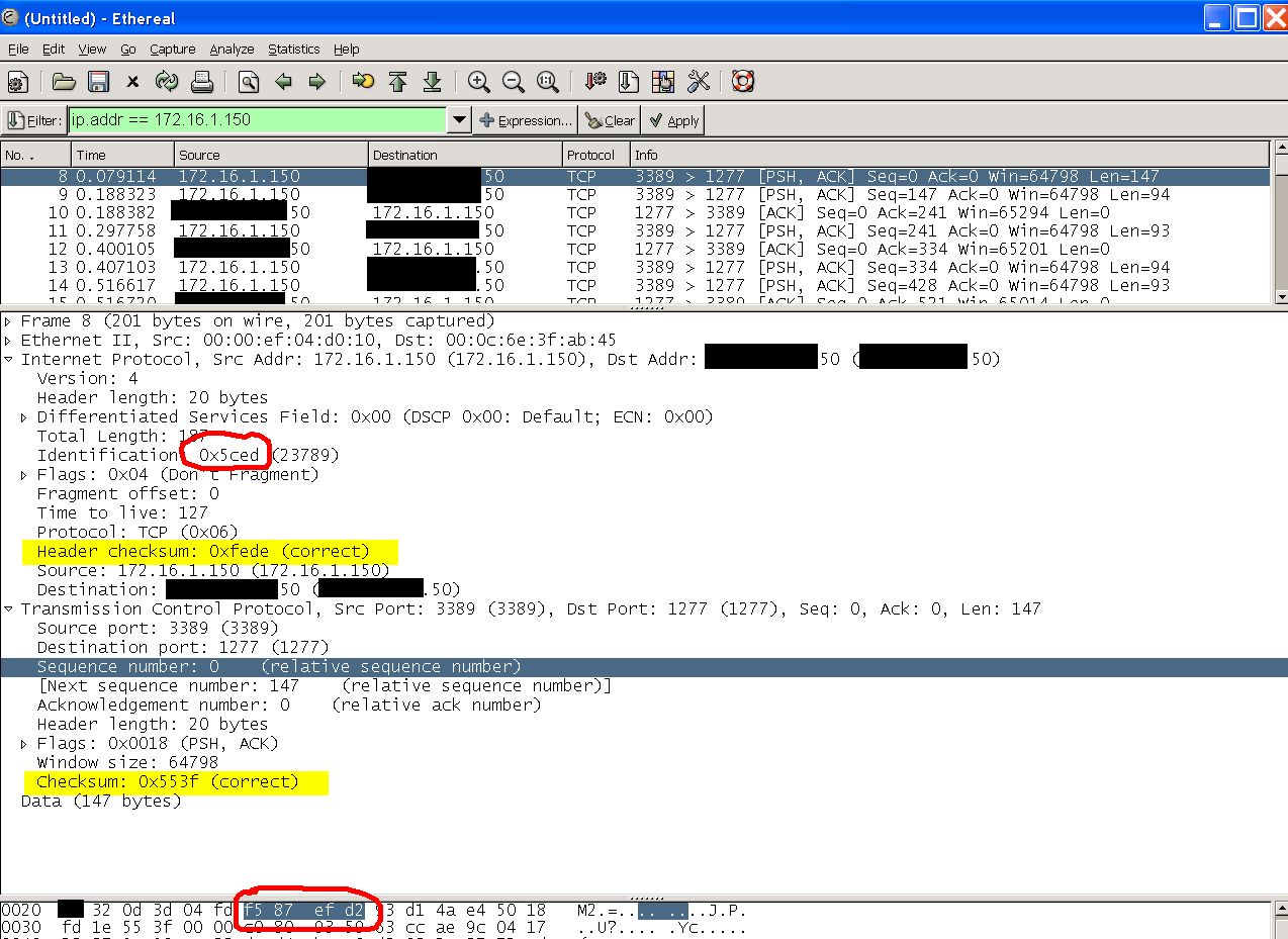 This figure is an Ethereal trace taken on the other host. Paranoia forces me to block out the IP address. It shows frame 395 from the above Network Monitor trace. We know its the same frame because the IP Identification field matches (0x5CED) and the sequence number matches (0xF587EFD2), we have to look at the hex dump of the packet because Ethereal shows only a relative sequence number in its detail window. Note that it shows the IP and TCP checksums with correct values.